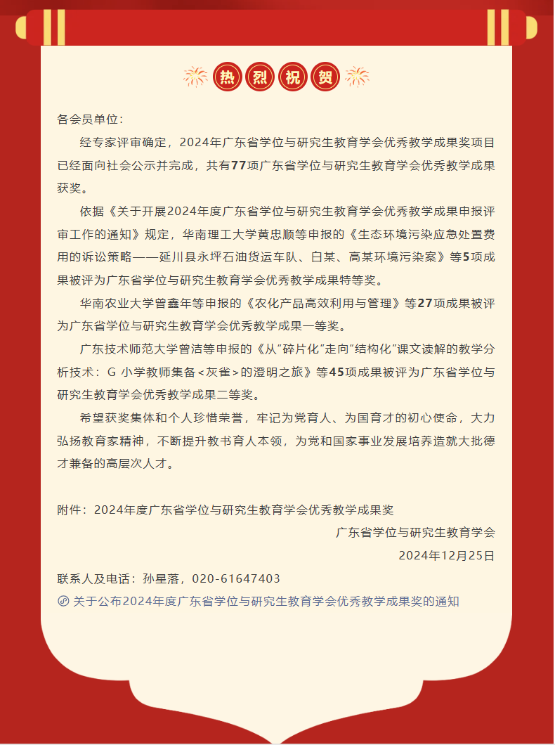 鼓励教师积极参与广东省学位与研究生教育学会主办的优秀教学成果申报评审工作。近日,评选结果揭晓,bbin平台