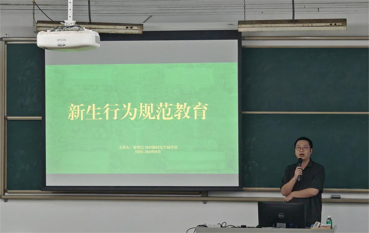 在新生行为规范教育中,2025级研究生辅导员徐仲之副教授为同学们带来了一场内容丰富的纪律教育讲座。徐老师结合典型案例,系统解读了学校的重要规章制度,提醒同学们要自觉遵守法律法规,强化法治意识与纪律意识。同时,他还以自身的经历为例,勉励新生在研究生阶段注重主动思考与实践,积极与导师沟通交流,从而更好地适应学术研究与专业成长的要求。