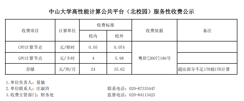 中山大学高性能计算公共平台(北校园)服务性收费公示
