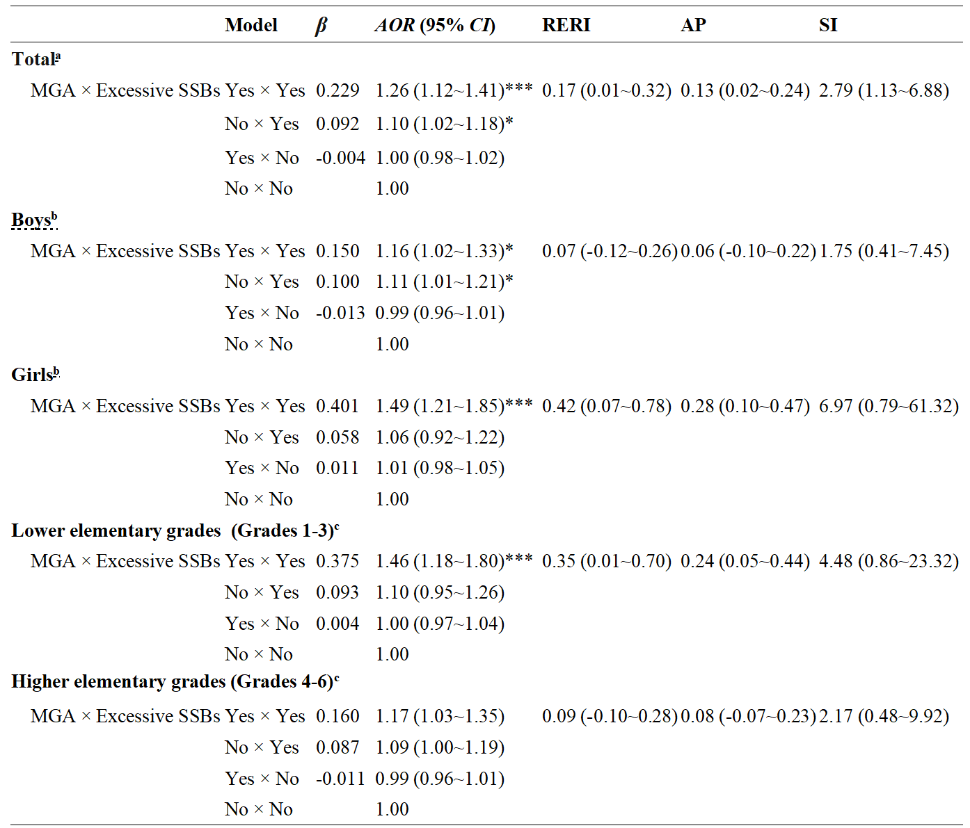 表1 中国学龄儿童MGA与过量SSBs摄入对超重/肥胖的相加交互作用