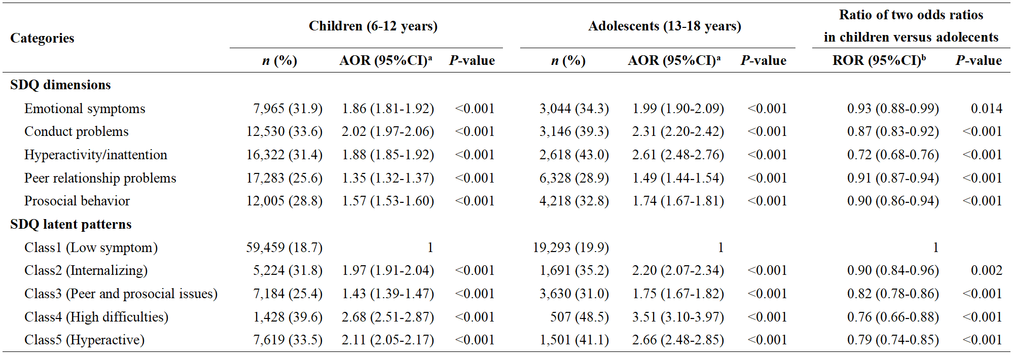表2儿童和青少年SDQ维度及潜类别模式与MGA的年龄特异性关联
