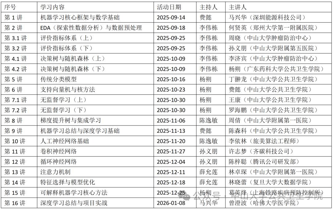 2025年9月至2026年1月期间,14位来自哈佛大学医学院、复旦大学大数据学院、中山大学肿瘤防治中心、腾讯公司等多元背景的主讲人,结合自身工作实际分享了机器学习在医学领域的应用。医学统计学系的5位在读研究生也担任部分内容的主讲。